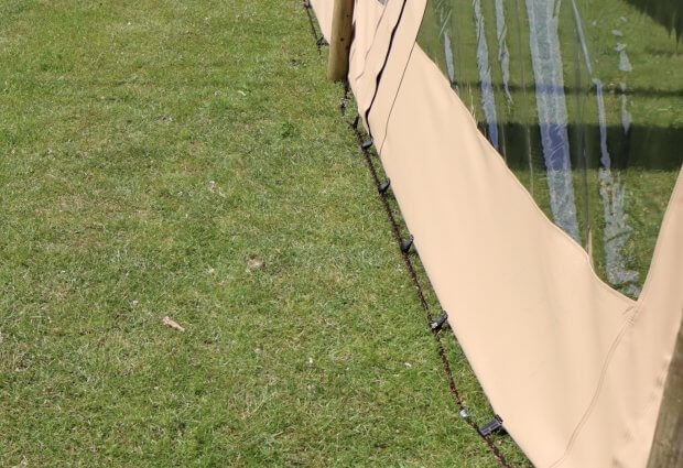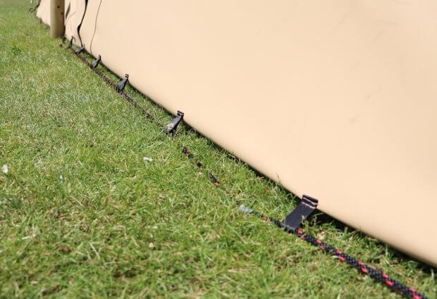 Las paredes laterales se fijan fácilmente con un cordón resistente y se ajustan a la perfección gracias a las resistentes correas de velcro que las sujetan a la tienda. Esto te permite crear un ambiente acogedor y protegido en un instante sin sacrificar el estilo de tu tienda elástica.